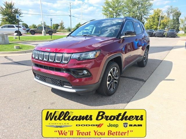 22/30 City/Highway MPGLeather Seats, Heated Seats, Bluetooth, Remote start, **FACTORY CERTIFIED**, 10.1" Touchscreen Display, 3.73 Axle Ratio, 4-Wheel Disc Brakes, 6 Speakers, ABS brakes, Air Conditioning, Alloy wheels, AM/FM radio: SiriusXM, Anti-whiplash front head restraints, Auto High-beam Headlights, Auto-dimming Rear-View mirror, Automatic temperature control, Brake assist, Bumpers: body-color, Compass, Delay-off headlights, Disassociated Touchscreen Display, Driver door bin, Driver vanity mirror, Dual front impact airbags, Dual front side impact airbags, Electronic Stability Control, Emergency communication system: SiriusXM Guardian, Four wheel independent suspension, Front anti-roll bar, Front Bucket Seats, Front Center Armrest w/Storage, Front dual zone A/C, Front fog lights, Front reading lights, Fully automatic headlights, Global Telematics Box Module (TBM), Gloss Black Exterior Mirrors, Heated door mirrors, Heated front seats, Heated steering wheel, Illuminated entry, Knee airbag, Leather Shift Knob, Leather Trimmed Bucket Seats, Low tire pressure warning, Occupant sensing airbag, Outside temperature display, Overhead airbag, Overhead console, Panic alarm, ParkView Rear Back-Up Camera, Passenger door bin, Passenger vanity mirror, Power door mirrors, Power driver seat, Power steering, Power windows, Quick Order Package 2GG, Radio: Uconnect 5 w/10.1" Display, Rain sensing wipers, Rear anti-roll bar, Rear seat center armrest, Rear window defroster, Rear window wiper, Remote keyless entry, Roof rack: rails only, Security system, Speed control, Split folding rear seat, Steering wheel mounted audio controls, Tachometer, Telescoping steering wheel, Tilt steering wheel, Traction control, Trip computer, Turn signal indicator mirrors, Variably intermittent wipers, Wheels: 18" x 7" Painted Diamond Cut Aluminum.2022 Jeep Compass Limited Velvet Red Pearlcoat Limited 4WD 9-Speed 948TE Automatic 2.4L I4Certified. FCA US LLC Certified Pre-Owned Details: * Warranty Deductible: $100 * Vehicle History * Transferable Warranty * 125 Point Inspection * Vehicles Up to 75,000 Miles and/or 5 Model Years. 24-Hour Towing & Roadside Assistance, Car Rental Allowance, CARFAX® Vehicle History ReportTM and an Introductory 3-month Subscription to SiriusXM® Satellite Radio & Certified Warranty Upgrades * Roadside Assistance * Powertrain Limited Warranty: 84 Month/100,000 Mile (whichever comes first) from original in-service date * Limited Warranty: 3 Month/3,000 Mile (whichever comes first) after new car warranty expires or from certified purchase dateQuick Order Package 2GG, 10.1" Touchscreen Display, 3.73 Axle Ratio, 4-Wheel Disc Brakes, 6 Speakers, ABS brakes, Air Conditioning, Alloy wheels, AM/FM radio: SiriusXM, Anti-whiplash front head restraints, Auto High-beam Headlights, Auto-dimming Rear-View mirror, Automatic temperature control, Brake assist, Bumpers: body-color, Compass, Delay-off headlights, Disassociated Touchscreen Display, Driver door bin, Driver vanity mirror, Dual front impact airbags, Dual front side impact airbags, Electronic Stability Control, Emergency communication system: SiriusXM Guardian, Four wheel independent suspension, Front anti-roll bar, Front Bucket Seats, Front Center Armrest w/Storage, Front dual zone A/C, Front fog lights, Front reading lights, Fully automatic headlights, Global Telematics Box Module (TBM), Gloss Black Exterior Mirrors, Heated door mirrors, Heated front seats, Heated steering wheel, Illuminated entry, Knee airbag, Leather Shift Knob, Leather Trimmed Bucket Seats, Low tire pressure warning, Occupant sensing airbag, Outside temperature display, Overhead airbag, Overhead console, Panic alarm, ParkView Rear Back-Up Camera, Passenger door bin, Passenger vanity mirror, Power door mirrors, Power driver seat, Power steering, Power windows, Radio: Uconnect 5 w/10.1" Display, Rain sensing wipers, Rear anti-roll bar, Rear seat center armrest, Rear window defroster, Rear window wip