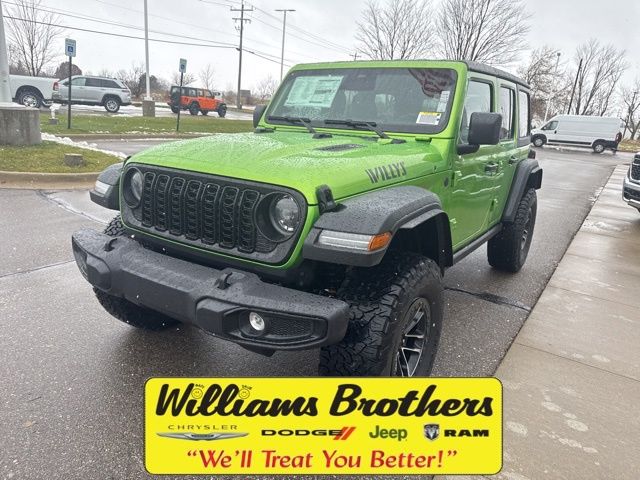 Dealer Discount of $4,764 off MSRP 18/23 City/Highway MPGMojito Clearcoat 2026 Jeep Wrangler Willys 4WD 8-Speed Automatic 3.6L V6 24V VVTConvenience Group (2-Door Passive Entry, Front Door Locks, Air Conditioning with Auto Temp Control, Air Filtering, Cluster 7.0" TFT Color Display, Emergency/Assistance Call, Heated Front Seats, Heated Steering Wheel, and Universal Garage Door Opener), Quick Order Package 24W Willys (4-Wheel Drive Swing Gate Decal, 7 and 4 Pin Wiring Harness, Advanced Brake Assist, Automatic Headlamps, Auxiliary Switches, Black Grille with Gloss Black Rings, Class II Receiver Hitch, Conventional Differential Front Axle, Corning Gorilla Glass, Dana M210 Wide HD Tube Front Axle, Dana M220 Wide Rear Axle, Daytime Running Lamps LED Accents, Deep Tint Sunscreen Windows, E-Locker Rear Axle, Enhanced Adaptive Cruise Control, Front LED Fog Lamps, Full Speed Forward Collision Warning Plus, Injection Molded Black Rear Bumper, LED Premium Reflector Headlamps, Mold in Color Bumper with Gloss Black, Molded in Color Rubicon Highline Flare, MOPAR All-Weather Floor Mats, Off-Road Plus Mode, Power Heated Mirrors, Premium Wrapped Steering Wheel, Security Alarm, Sun Visors with Illuminated Vanity Mirrors, Wheels: 17" x 7.5" Painted Black, Willy's Suspension, and Willys Hood Decal), Steel Power Dome Hood Package (Power Dome Dual Vented Hood), Trailer Tow and Auxiliary Switch Group, Xtreme 35 Tire Package (35" Tire Suspension, Anti-Lock 4-Wheel Disc Perf Brakes, MOPAR Hinge-Gate Reinforcement, MOPAR Jack Spacer, MOPAR Tire Relocation Kit, Wheel Flare Extensions, and Wheels: 17" x 8" Machined with Black Pockets), 12.3" Touchscreen Display, 4-Wheel Disc Brakes, 4G LTE Wi-Fi Hot Spot, 8 Speakers, ABS brakes, Air Conditioning, AM/FM radio: SiriusXM with 360L, Apple CarPlay, Apple CarPlay/Android Auto, Aux Battery, Black 3-Piece Hard Top, Brake assist, Compass, Connectivity - US/Canada, Delay-off headlights, Driver door bin, Driver vanity mirror, Dual front impact airbags, Dual front side impact airbags, Electronic Stability Control, For More Info, Call 800-643-2112, Freedom Panel Storage Bag, Front anti-roll bar, Front Bucket Seats, Front Center Armrest w/Storage, Front fog lights, Front reading lights, Google Android Auto, Illuminated entry, Integrated Center Stack Radio, Integrated roll-over protection, Low tire pressure warning, Manufacture Statement of Origin, MOPAR Cargo Tub Liner, MOPAR Hardtop Headliner, MOPAR Plastic Door Sill Guards, No Soft Top, Non-Lock Fuel Cap Without Discriminator, Normal Duty Suspension, Occupant sensing airbag, Outside temperature display, Overhead airbag, Panic alarm, ParkView Rear Back-Up Camera, Passenger door bin, Passenger vanity mirror, Power steering, Power windows, Radio data system, Radio: Uconnect 5 with 12.3" Display, Rear anti-roll bar, Rear reading lights, Rear Window Defroster, Rear Window Wiper/Washer, Remote keyless entry, SiriusXM Radio Service, SiriusXM with 360L, Speed control, Split folding rear seat, Steering wheel mounted audio controls, Stop-Start Dual Battery System, Tachometer, Telescoping steering wheel, Tilt steering wheel, Traction control, Trip computer, Variably intermittent wipers, and Wheels: 17" x 7.5" Black Steel Styled.