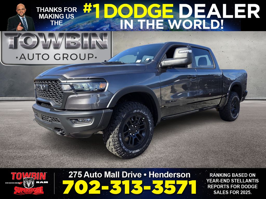 2026 Ram 1500 Rebel Granite Crystal Metallic ClearcoatGo Big and Go Bold with Towbin Ram Trucks! Quality Never Goes Out of Style. When Ram Trucks took inspiration from the world’s best, we found ourselves among them. If your looking for a Ram Dealer near you, come check out our extensive selection of New Ram Trucks at Towbin Dodge Ram, located conveniently in the Valley Auto Mall.4WD 8-Speed Automatic 3.0L I6Thanks for checking out this great vehicle. When looking to buy pre-owned, why not buy from the #1 Dodge dealer in Nevada? Give us a call or come see why everyone drives out saying, I got a great deal at Towbin Dodge! Price includes: $3500 - 2026 National Retail Bonus Cash . Exp. 04/30/2026 $750 - 2026 West BC Spring Boost Retail Bonus Cash . Exp. 04/30/2026