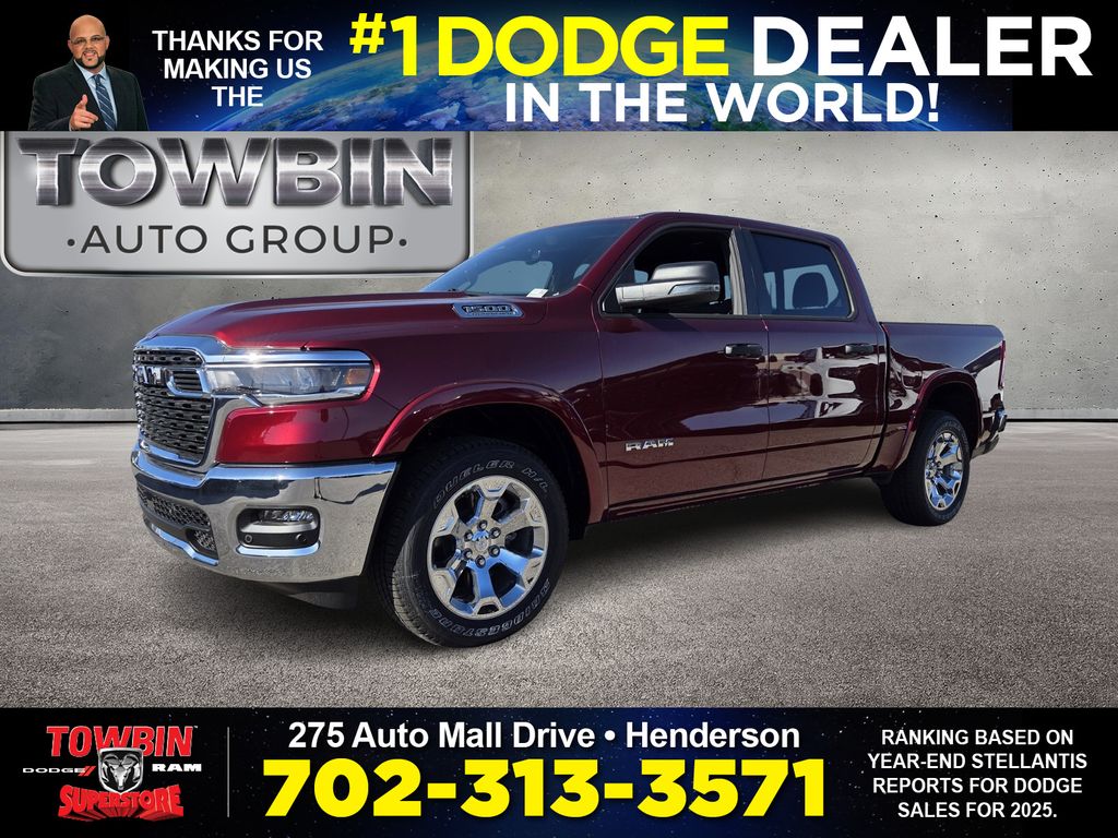 2026 Ram 1500 Big Horn/Lone Star Delmonico Red PearlcoatWelcome to Towbin Dodge, #1 Dodge dealer in the world! This isnt just any used car- it has been handpicked and thoroughly inspected to meet the high standards we are known for, From everyday budget options to SRT and Luxury models, weve got something for every lifestyle and price point. At Towbin we make used car buying easy, affordable, and exciting.RWD 8-Speed Automatic 3.0L I6For your understanding: Sale Price includes guaranteed factory rebates for Nevada residents on vehicle purchase, not leases. Some residency restrictions do apply. Please inquire with a sales representative about your residency pricing and discounts and any additional rebates or incentives that you may qualify for. Final selling price does not include tax, tag, title, and $699 doc fee. Dealer retains all factory rebates and incentives. Final Selling Price may include pricing adjustments due to market demand. Please inquire with a sales representative for these specific models. The factory rebates may not be available on this vehicle if you elect to take advantage of a Special Alternative APR or Special Lease program. While great effort is made to ensure the accuracy of the information on this site, errors may occur so please verify information with a customer service rep. Prices and payments are subject to change based on manufacturer incentives. To verify 100% accuracy of pricing please call us at (702) 558-3800 or by visiting us at the dealership in person. Price includes: $3500 - 2026 National Retail Bonus Cash . Exp. 04/30/2026 $750 - 2026 West BC Bonus Cash . Exp. 04/30/2026