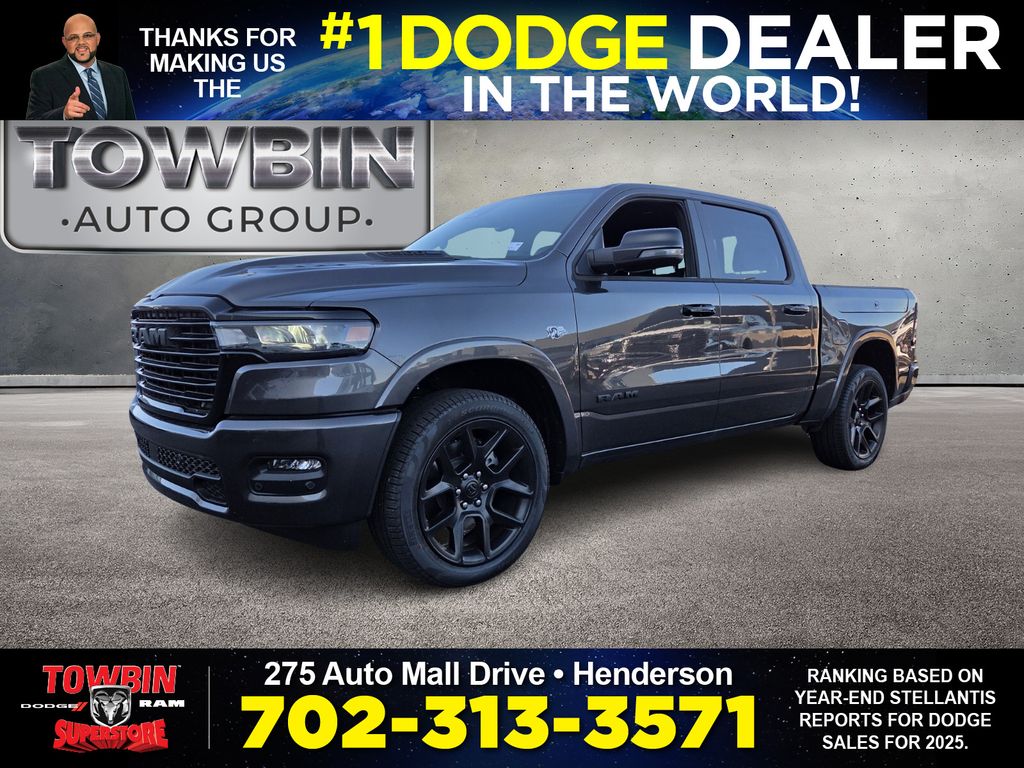 2026 Ram 1500 Laramie Granite Crystal Metallic ClearcoatGo Big and Go Bold with Towbin Ram Trucks! Quality Never Goes Out of Style. When Ram Trucks took inspiration from the world’s best, we found ourselves among them. If your looking for a Ram Dealer near you, come check out our extensive selection of New Ram Trucks at Towbin Dodge Ram, located conveniently in the Valley Auto Mall.4WD 8-Speed Automatic HEMI 5.7L V8 Multi Displacement VVT eTorqueThanks for checking out this great vehicle. When looking to buy pre-owned, why not buy from the #1 Dodge dealer in Nevada? Give us a call or come see why everyone drives out saying, I got a great deal at Towbin Dodge! Price includes: $3500 - 2026 National Retail Bonus Cash . Exp. 04/30/2026