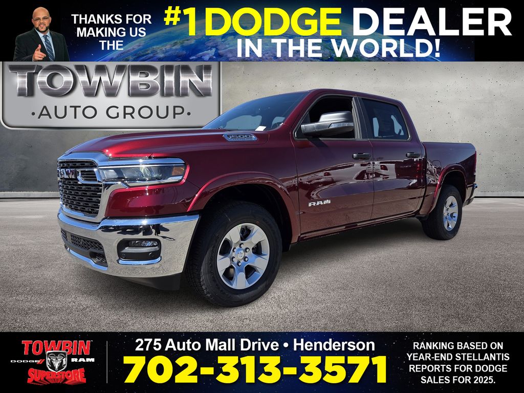 2026 Ram 1500 Big Horn/Lone Star Delmonico Red PearlcoatWelcome to Towbin Dodge, #1 Dodge dealer in the world! This isnt just any used car- it has been handpicked and thoroughly inspected to meet the high standards we are known for, From everyday budget options to SRT and Luxury models, weve got something for every lifestyle and price point. At Towbin we make used car buying easy, affordable, and exciting.RWD 8-Speed Automatic 3.0L I6For your understanding: Sale Price includes guaranteed factory rebates for Nevada residents on vehicle purchase, not leases. Some residency restrictions do apply. Please inquire with a sales representative about your residency pricing and discounts and any additional rebates or incentives that you may qualify for. Final selling price does not include tax, tag, title, and $699 doc fee. Dealer retains all factory rebates and incentives. Final Selling Price may include pricing adjustments due to market demand. Please inquire with a sales representative for these specific models. The factory rebates may not be available on this vehicle if you elect to take advantage of a Special Alternative APR or Special Lease program. While great effort is made to ensure the accuracy of the information on this site, errors may occur so please verify information with a customer service rep. Prices and payments are subject to change based on manufacturer incentives. To verify 100% accuracy of pricing please call us at (702) 558-3800 or by visiting us at the dealership in person. Price includes: $3500 - 2026 National Retail Bonus Cash . Exp. 04/30/2026 $750 - 2026 West BC Bonus Cash . Exp. 04/30/2026
