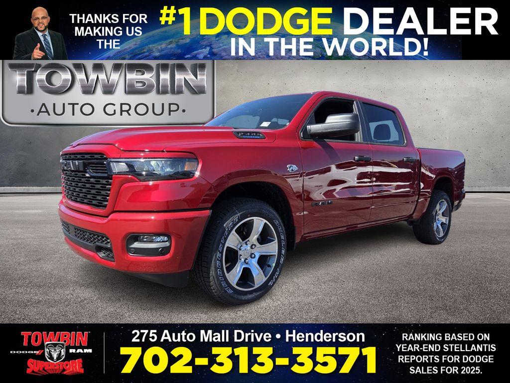 This 2026 Ram 1500 Express is a new vehicle with 12 mi (delivery miles only). It is equipped with 8-Speed Automatic RWD and runs on Gasoline. The vehicle has a Molten Red Pearlcoat exterior and Black interior. This specific vehicle (VIN: 1C6RREGT2TN346558) is currently available for sale in Henderson, Nevada (ZIP 89014), Clark County and is offered by Towbin Alfa Romeo for immediate purchase.