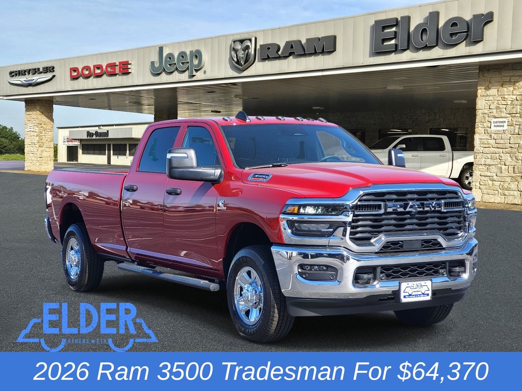 Priced below KBB Fair Purchase Price!Factory MSRP: $73,370 $9,000 off MSRP!$5,044 below Invoice!Molten Red 2026 Ram 3500 Tradesman 6.7L I6 4WD 8-Speed AutomaticWelcome to Elder Chrysler Dodge Jeep Ram, where our attitude is the difference! Family-owned and -operated since its inception over three decades ago, our Dodge and Ram dealership in Athens, TX, believes that every one of our customers should be treated like a member of the Elder family. When you visit our Texas Ram dealer, you’re always going to run into an Elder who will greet you with a smiling face and help you find exactly what you’re looking for. We make a substantial effort to reach out and converse with every person who enters our dealership looking for sales or service. Quite simply, we don’t believe in having hooks or gimmicks to drive sales. We understand that if we provide you with superior treatment the first time you visit us, you’ll be sure to come back to us again in the future. We treat you like family and we always welcome our family members with open arms. Our business is driven by you — our loyal customers — and the way that Elder Chrysler Dodge Jeep Ram treats the people who walk through our doors is what helps us forge long-lasting relationships over time.More Reasons to Buy from Elder Chrysler Dodge Jeep Ram Our dealership is not part of a major automotive group and isn’t held back by corporate restrictions, so our customers can enjoy no-pressure negotiations and transparent sales when they shop with us. We not only carry all your favorite Chrysler, Dodge, Ram and Jeep models, but we also have an extensive commercial truck and van inventory that could help you build your fleet! Elder Chrysler Dodge Jeep Ram is a proud recipient of the Customer First Award for Excellence. Our Athens, TX, dealer is among a group of elite dealerships that have proven to provide the best sales and service experience. We are very involved in our East Texas community, supporting schools, events and local organizations. We sponsor the local chapters of the FFA (Future Farmers of America), give a $1,000 scholarship out to deserving students and we spend close to $100,000 a year on community outreach. Price includes: $1000 - 2026 National Bonus Cash . Exp. 03/02/2026 $1000 - 2026 Southwest BC Retail Bonus Cash . Exp. 03/02/2026 $2000 - 2026 Southwest BC State of Texas Regional Bonus Cash . Exp. 03/02/2026