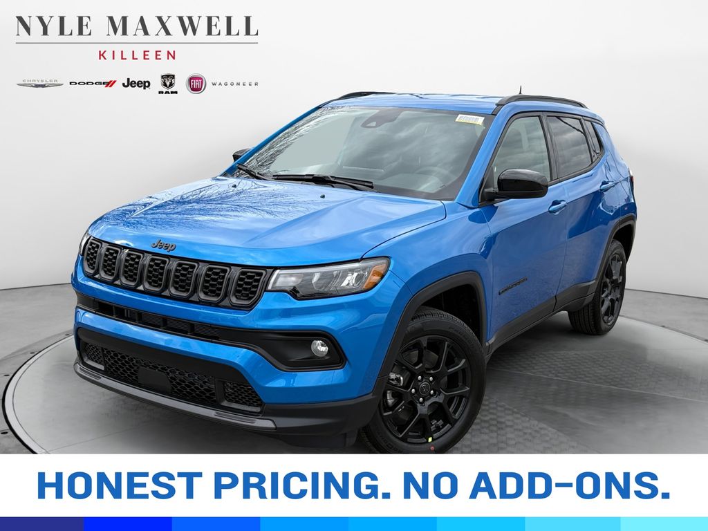 ***CALL 254-200-3900*** **Manufacturer’s Rebate subject to residency restrictions. Any customer not meeting the residency restrictions will receive a dealer discount in the same amount of the manufacturer’s rebate.Priced below KBB Fair Purchase Price! 23/31 City/Highway MPGhydro blue pearlcoat 2026 Jeep Compass Latitude Latitude 4WD 2.0L I4 DOHC 4WD. Quick Order Package 29N Altitude (10.1" Touchscreen Display, Altitude Special Edition, Black Day Light Opening Moldings, Gloss Black Surround/Neutral Gray Rings, Neutral Gray Exterior Badging, Piano Black Interior Accents, Sliding Sun Visors with Illuminated Mirrors, and Wheels: 18" x 7" Gloss Black Painted Aluminum), 4WD, 17" x 7" Aluminum Wheels, 3.73 Final Drive Ratio, 4-Wheel Disc Brakes, 4G LTE Wi-Fi Hot Spot, 6 Speakers, ABS brakes, Air Conditioning, AM/FM radio: SiriusXM, Auto High-beam Headlights, Automatic temperature control, Bluetooth Handsfree Phone and Audio, Brake assist, Bumpers: body-color, Compass, Delay-off headlights, Driver door bin, Driver vanity mirror, Dual front impact airbags, Dual front side impact airbags, Electronic Stability Control, Emergency communication system: SiriusXM Guardian, Four wheel independent suspension, Front anti-roll bar, Front Bucket Seats, Front Center Armrest w/Storage, Front fog lights, Front License Plate Bracket, Front reading lights, Fully automatic headlights, Global Telematics Box Module, Heated door mirrors, Heated front seats, Heated steering wheel, Illuminated entry, Knee airbag, Leather Shift Knob, Leather steering wheel, Low tire pressure warning, Occupant sensing airbag, Outside temperature display, Overhead airbag, Overhead console, Panic alarm, ParkView Rear Back-Up Camera, Passenger door bin, Passenger vanity mirror, Power door mirrors, Power steering, Power windows, Premium audio system: UConnect 5, Premium Cloth/Vinyl Bucket Seats, Radio: Uconnect 5 with 8.4" Display, Rear anti-roll bar, Rear seat center armrest, Rear window defroster, Rear window wiper, Remote keyless entry, Security system, SiriusXM Satellite Radio, Speed control, Split folding rear seat, Spoiler, Steering wheel mounted audio controls, Tachometer, Telescoping steering wheel, Tilt steering wheel, Traction control, Trip computer, and Variably intermittent wipers Get peace of mind and protection with our new Maxwell Forever protection. It protects your vehicle for as long as you own it and is included for FREE! Price includes: $1000 - 2026 National Retail Bonus Cash . Exp. 03/02/2026 $1000 - 2026 National Stellantis Loyalty Bonus Cash . Exp. 03/02/2026 $750 - 2026 Southwest BC Bonus Cash . Exp. 03/02/2026