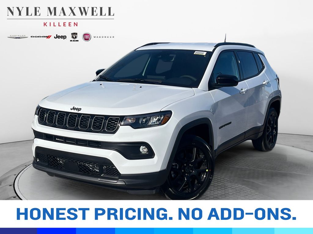 ***CALL 254-200-3900*** **Manufacturer’s Rebate subject to residency restrictions. Any customer not meeting the residency restrictions will receive a dealer discount in the same amount of the manufacturer’s rebate.Priced below KBB Fair Purchase Price! 23/31 City/Highway MPGBright White Clearcoat 2026 Jeep Compass Latitude Latitude 4WD 2.0L I4 DOHC 4WD. Quick Order Package 29N Altitude (10.1" Touchscreen Display, Altitude Special Edition, Black Day Light Opening Moldings, Gloss Black Surround/Neutral Gray Rings, Neutral Gray Exterior Badging, Piano Black Interior Accents, Sliding Sun Visors with Illuminated Mirrors, and Wheels: 18" x 7" Gloss Black Painted Aluminum), 4WD, 17" x 7" Aluminum Wheels, 3.73 Final Drive Ratio, 4-Wheel Disc Brakes, 4G LTE Wi-Fi Hot Spot, 6 Speakers, ABS brakes, Air Conditioning, AM/FM radio: SiriusXM, Auto High-beam Headlights, Automatic temperature control, Bluetooth Handsfree Phone and Audio, Brake assist, Bumpers: body-color, Compass, Delay-off headlights, Driver door bin, Driver vanity mirror, Dual front impact airbags, Dual front side impact airbags, Electronic Stability Control, Emergency communication system: SiriusXM Guardian, Four wheel independent suspension, Front anti-roll bar, Front Bucket Seats, Front Center Armrest w/Storage, Front fog lights, Front License Plate Bracket, Front reading lights, Fully automatic headlights, Global Telematics Box Module, Heated door mirrors, Heated front seats, Heated steering wheel, Illuminated entry, Knee airbag, Leather Shift Knob, Leather steering wheel, Low tire pressure warning, Occupant sensing airbag, Outside temperature display, Overhead airbag, Overhead console, Panic alarm, ParkView Rear Back-Up Camera, Passenger door bin, Passenger vanity mirror, Power door mirrors, Power steering, Power windows, Premium audio system: UConnect 5, Premium Cloth/Vinyl Bucket Seats, Radio: Uconnect 5 with 8.4" Display, Rear anti-roll bar, Rear seat center armrest, Rear window defroster, Rear window wiper, Remote keyless entry, Security system, SiriusXM Satellite Radio, Speed control, Split folding rear seat, Spoiler, Steering wheel mounted audio controls, Tachometer, Telescoping steering wheel, Tilt steering wheel, Traction control, Trip computer, and Variably intermittent wipers Get peace of mind and protection with our new Maxwell Forever protection. It protects your vehicle for as long as you own it and is included for FREE! Price includes: $1000 - 2026 National Retail Bonus Cash . Exp. 03/02/2026 $1000 - 2026 National Stellantis Loyalty Bonus Cash . Exp. 03/02/2026 $750 - 2026 Southwest BC Bonus Cash . Exp. 03/02/2026