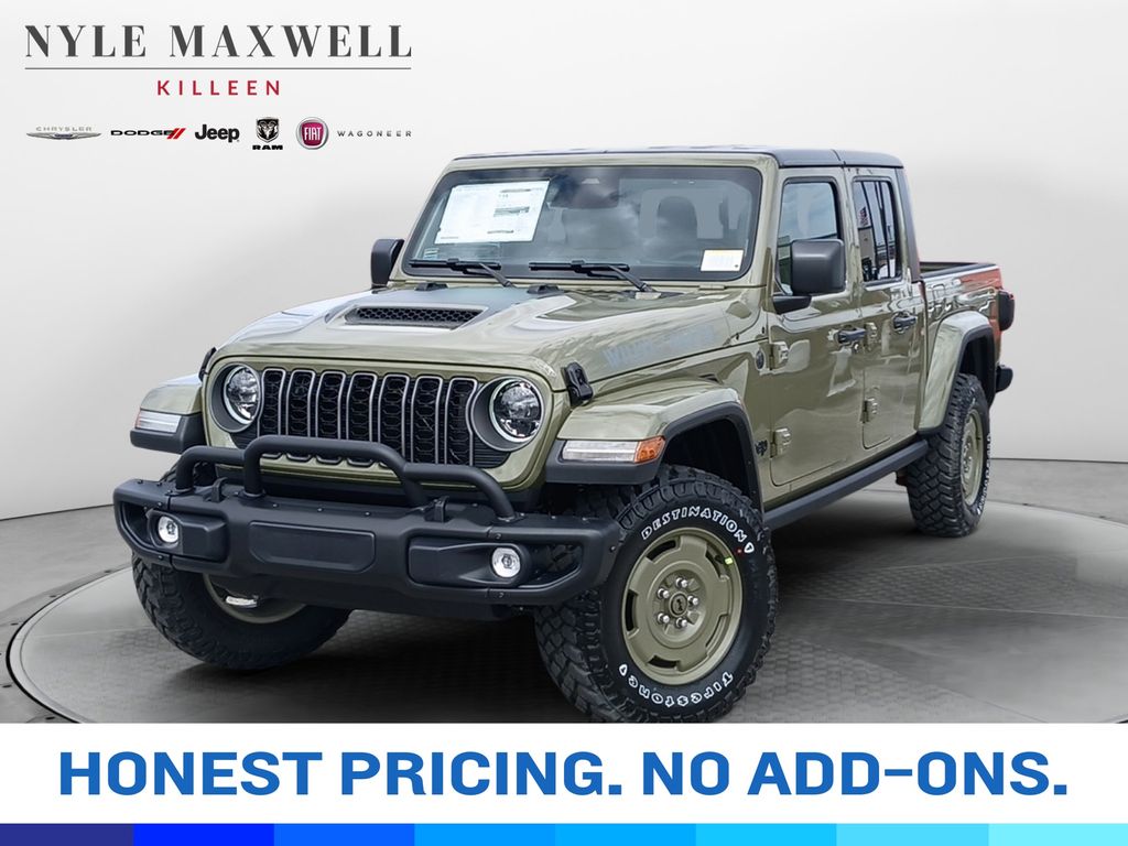 ***CALL 254-200-3900*** **Manufacturer’s Rebate subject to residency restrictions. Any customer not meeting the residency restrictions will receive a dealer discount in the same amount of the manufacturer’s rebate.Green 2026 Jeep Gladiator Sport Sport 4WD 3.6L V6 24V VVT Convenience Group (Air Conditioning with Auto Temp Control, Cluster 7.0" TFT Color Display, Corning Gorilla Glass, Daytime Running Lamp System, Emergency/Assistance Call, Front Door Locks 2-Door Passive Entry, Heated Front Seats, Heated Steering Wheel, Remote Start System, and Universal Garage Door Opener), Quick Order Package 24T Willys 41 (2-Piece Body Color Fender Flares, 4WD Willys '41 Tailgate Decal, 97 Mph Vehicle Max Speed Calibration, Advanced Brake Assist, Automatic Headlamps, Auxiliary Switches, Central ADAS Decision Module (CADM), Class IV Receiver Hitch, Cloth Low-Back Bucket Seats, Daytime Running Lamps LED Accents, Deep Tint Sunscreen Windows, E-Locker Rear Axle, Front Heavy Duty Red Accent Shock Absorbers, Front LED Fog Lamps, Full Speed Forward Collision Warning Plus, Green Soul Cloth Wrapped Mid-Bolster, Heavy-Duty Engine Cooling, LED Premium Reflector Headlamps, LED Taillamps, MOPAR All-Weather Slush Mats, MOPAR Black Hood Graphic, MOPAR Triple Hoop Grille Guard, Off-Road Plus Mode, Performance Hood, Power Heated Mirrors, Premium Wrapped Steering Wheel, Protection Sill Rails, Rear Heavy Duty Red Accent Shock Absorbers, Security Alarm, Steel Front Bumper, Sun Visors with Illuminated Vanity Mirrors, Trailer Hitch Zoom, Wheels: 17" x 7.5" Fully Painted, Willys '41, Willys '41 Retro Edition Gladiator Decal, Willys '41 US Edition U.S. Hood Decal, and Willys Suspension), 110 Mph Vehicle Max Speed Calibration, 12.3" Touchscreen Display, 3.73 Rear Axle Ratio, 4-Wheel Disc Brakes, 4G LTE Wi-Fi Hot Spot, 8 Speakers, ABS brakes, Air Conditioning, Alexa Built-in, AM/FM radio: SiriusXM with 360L, Apple CarPlay, Apple CarPlay/Android Auto, Black 3-Piece Hard Top, Brake assist, Compass, Connectivity - US/Canada, Delay-off headlights, Driver door bin, Driver vanity mirror, Dual front impact airbags, Dual front side impact airbags, Electronic Stability Control, For Details, Visit DriveUconnect.com, Freedom Panel Storage Bag, Front anti-roll bar, Front Bucket Seats, Front Center Armrest w/Storage, Front fog lights, Front reading lights, Google Android Auto, Illuminated entry, Integrated Center Stack Radio, Integrated roll-over protection, Low tire pressure warning, Normal Duty Suspension, Occupant sensing airbag, Outside temperature display, Overhead airbag, Panic alarm, ParkView Rear Back-Up Camera, Passenger door bin, Passenger vanity mirror, Power steering, Power windows, Radio data system, Radio: Uconnect 5 with 12.3" Display, Rear anti-roll bar, Rear reading lights, Rear Sliding Window, Rear Window Defroster, Remote keyless entry, SiriusXM Radio Service, SiriusXM with 360L, Speed control, Split folding rear seat, Steering wheel mounted audio controls, Tachometer, Telescoping steering wheel, Tilt steering wheel, Traction control, Trip computer, USB Host Flip, Variably intermittent wipers, Voltmeter, and Wheels: 17" x 7.5" Black Steel Styled Get peace of mind and protection with our new Maxwell Forever protection. It protects your vehicle for as long as you own it and is included for FREE!
