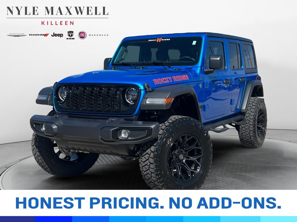 This 2026 Jeep Wrangler Willys is a new vehicle with 35 mi (delivery miles only). It is equipped with 8-Speed Automatic 4WD and runs on Gasoline. The vehicle has a Hydro Blue Pearl Coat exterior and Black interior. This specific vehicle (VIN: 1C4PJXDG3TW216647) is currently available for sale in Killeen, Texas (ZIP 76543), Bell County and is offered by Nyle Maxwell CDJR Killeen for immediate purchase.