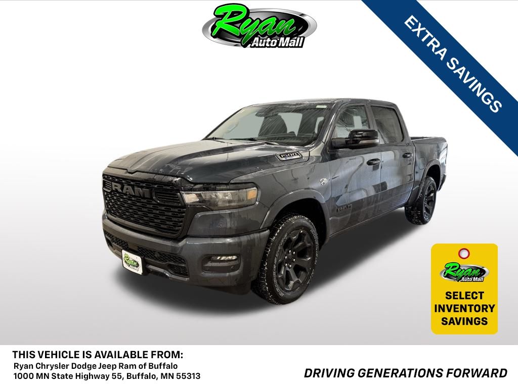 The 2026 Ram 1500 Big Horn/Lone Star Crew Cab 4x4, available now at Ryan Chrysler Dodge Jeep Ram in Buffalo, MN, delivers the capability, comfort, and advanced technology todays truck buyers demand. Built on the 144.5-inch wheelbase with a 5-foot 7-inch box, this versatile half-ton pickup blends rugged power with refined everyday usability, making it an ideal choice for drivers throughout Wright County and the Greater Buffalo area.This model is powered by the legendary 5.7L HEMI V8 with eTorque, a mild-hybrid system that enhances low-end torque, improves efficiency, and boosts towing performance. Paired with the smooth 8-speed automatic transmission, the Ram 1500 offers confident acceleration, responsive handling, and the strength needed for trailering, hauling, and winter driving in Minnesota. A 3.92 rear axle ratio further enhances pulling power, while the advanced 4x4 system provides year-round traction for Buffalo-area roads.The Big Horn/Lone Star Level 1 Equipment Group elevates cabin comfort with premium features including a power driver seat, heated front seats, a heated steering wheel, rear power-sliding window, second-row in-floor storage, automatic-dimming rearview mirror, and an upgraded infotainment experience with smartphone integration. Deluxe cloth bucket seats in Black add a refined look, while the cabin layout maximizes storage, comfort, and passenger space.The Night Edition package gives this truck a bold, modern presence with black exterior accents, 20-inch black wheels, body-color bumpers, a black grille, and darkened badging. Finished in Forged Blue Metallic, this truck stands out on the road with a sleek, aggressive profile. Additional towing capability comes from the integrated trailer brake controller, designed to provide greater stability and confidence when hauling equipment, campers, or boats across Minnesota.Standard Ram 1500 features include advanced driver assistance systems, push-button start, power windows and locks, deep-tinted glass, LED exterior lighting, and a well-appointed cabin designed for long-distance comfort. The trucks robust frame, coil-spring rear suspension, and aerodynamic design contribute to a smooth, quiet ride that sets the Ram 1500 apart in the full-size truck market.For buyers seeking strong capability, upscale comfort, and head-turning style, the 2026 Ram 1500 Big Horn/Lone Star Crew Cab 4x4 offers exceptional value and performance. Contact us for availability and a test drive today.Buy with confidence at Ryan Auto Mall. With over 22,500 reviews, 9 GM Mark of Excellence awards, and 65 MN DealerRater Dealer of the Year honors, our reputation is proven. Pricing includes all unconditional manufacturer rebates; tax, title, license, and a $350 doc fee are additional. Every vehicle is pre-fitted with PULSE, our rear-end collision deterrent system, available for just $399. Visit us at 1000 E Highway 55, Buffalo, MN 55313, or call 763-373-9300 to schedule your test drive and experience the Ryan difference. Price includes the following offers that everybody qualifies for:$2000 - 2026 National Select Inventory Bonus Cash. Exp. 03/02/2026 $3500 - 2026 National Retail Consumer Cash . Exp. 03/02/2026