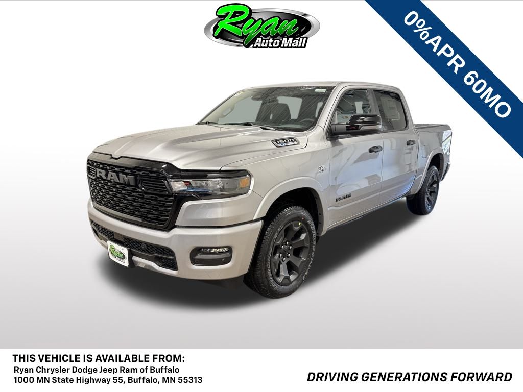Discover capability, comfort, and bold styling in the 2026 Ram 1500 Big Horn Crew Cab 4x4, available now at Ryan Chrysler Dodge Jeep Ram in Buffalo, MN. Engineered for hardworking drivers across Wright County, this truck blends rugged power with premium refinement, making it ideal for daily use, weekend projects, and towing needs throughout Buffalo, Monticello, Maple Lake, and surrounding communities.This Ram 1500 features a Billet Silver Metallic Clear-Coat exterior enhanced by the Night Edition appearance package, delivering a striking, modern look with body-color bumpers, accent-color premium power mirrors, and exclusive badging. The Symbol of Protest accents and G/T performance exhaust give the truck added presence and sound, while 20-inch all-season tires and body-color fender flares complete the confident stance.Under the hood, the legendary 5.7L HEMI V8 with eTorque mild-hybrid technology offers impressive towing strength, smooth acceleration, and efficient performance. The 4x4 system, anti-spin rear differential, active noise-control system, and 3.92 rear axle ratio provide exceptional traction, power delivery, and capability whether navigating snowy Minnesota roads, hauling equipment, or exploring northern lakes and trails. A factory-integrated trailer brake controller enhances towing control and safety.Inside, the spacious Crew Cab offers refined comfort and advanced technology. The Big Horn Level 2 Equipment Group adds heated front seats, a heated leather-wrapped steering wheel, an 8-way power drivers seat with lumbar support, dual-zone automatic climate control, power-folding mirrors, and a rear power-sliding window. Convenient storage solutions include 2nd-row in-floor storage bins, rear seatback map pockets, and a 60/40 folding rear seat. Entertainment and connectivity are front and center with the Uconnect 5 NAV system featuring a large 12-inch touchscreen, navigation, SiriusXM with trial subscription, travel and traffic services, Bluetooth, and smartphone integration.Premium audio with 9 amplified speakers and a subwoofer provides immersive cabin sound, while a digital 7-inch instrument cluster keeps critical vehicle information easy to view. Additional features include remote entry, a universal garage-door opener, automatic-dimming rearview mirror, power-adjustable pedals, and power tailgate release. Safety and driver-assistance systems support confident driving around Buffalo and beyond.Built for capability and comfort, this 2026 Ram 1500 Big Horn Crew Cab 4x4 is the perfect fit for Minnesota truck owners who want power, style, and dependability in every drive.Contact us for availability and a test drive today.Buy with confidence at Ryan Auto Mall. With over 22,500 reviews, 9 GM Mark of Excellence awards, and 65 MN DealerRater Dealer of the Year honors, our reputation is proven. Pricing includes all unconditional manufacturer rebates; tax, title, license, and a $350 doc fee are additional. Every vehicle is pre-fitted with PULSE, our rear-end collision deterrent system, available for just $399. Visit us at 1000 E Highway 55, Buffalo, MN 55313, or call 763-373-9300 to schedule your test drive and experience the Ryan difference. Price includes the following offers that everybody qualifies for:$3500 - 2026 National Retail Consumer Cash . Exp. 03/02/2026